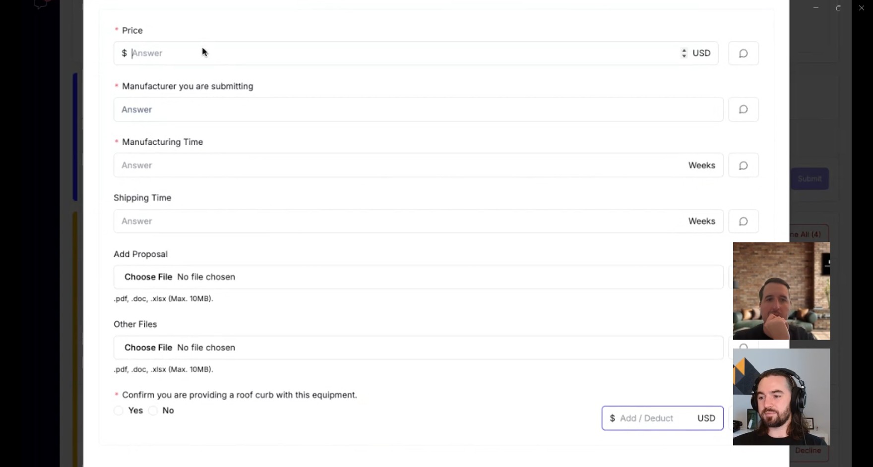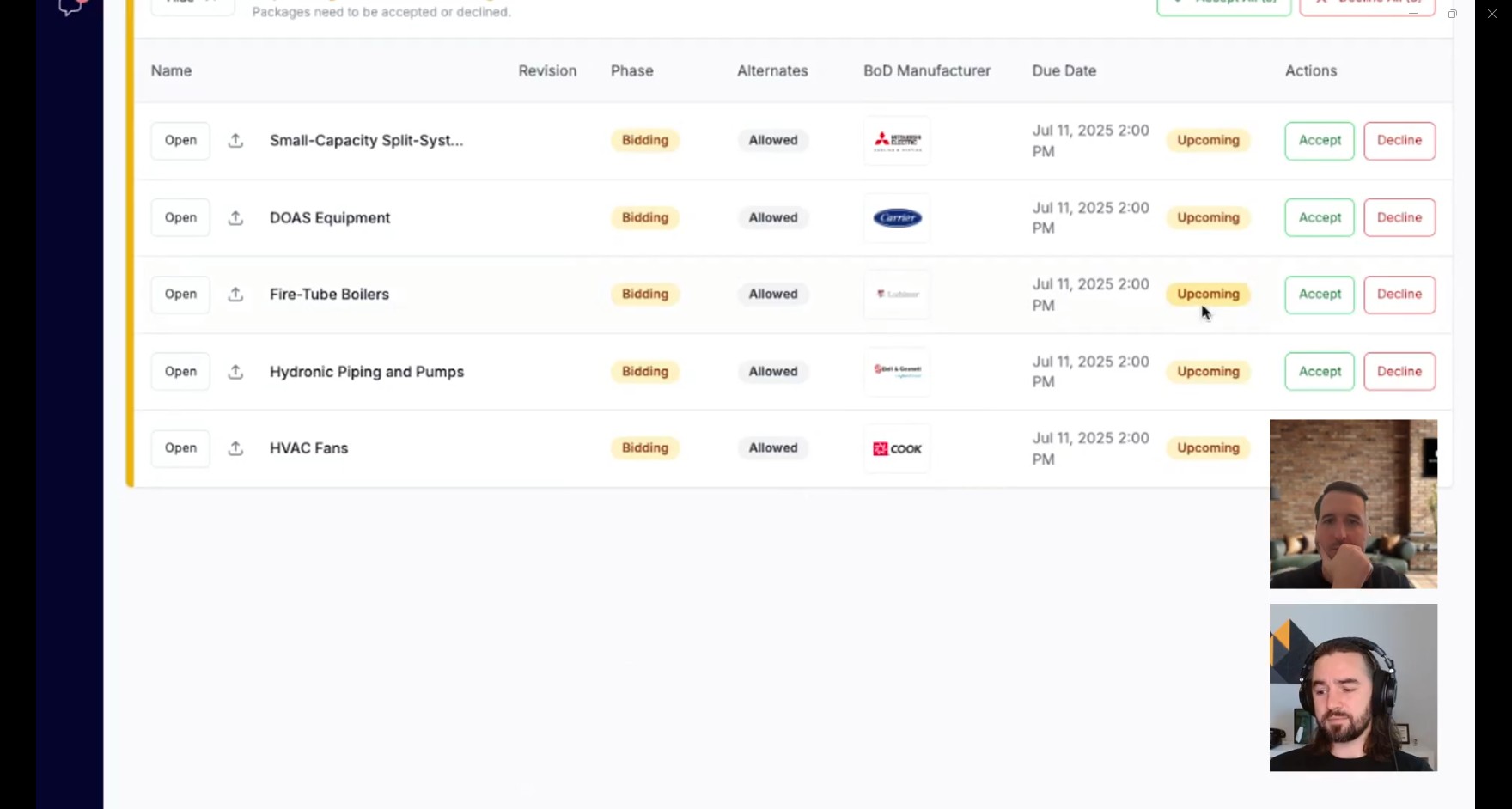 Today’s equipment procurement process is inefficient and fragmented. General contractors receive project plans and send entire document packages—often exceeding 200 pages—to hundreds of vendors via bulk email or shared drives. Vendors must manually sift through these documents to identify the equipment they can bid on, which leads to apples-to-oranges comparisons when quotes are returned, wasted time for both buyers and suppliers, inconsistent pricing and package configurations, and a lack of structured data for future analysis.