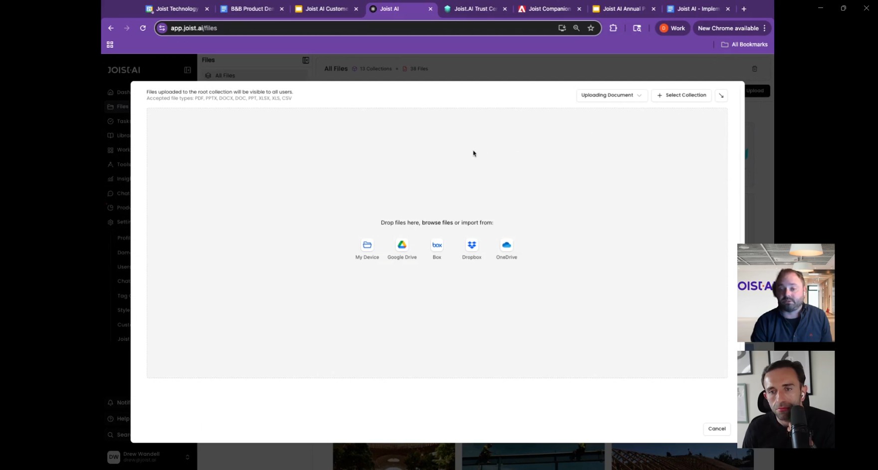 Joist's setup is remarkably simple: drag and drop 3-5 years of proposals, resumes, case studies, award submissions, and boilerplate copy—any text-based marketing content—into the platform. The system automatically annotates and classifies every page into distinct objects like cover letters, technical writeups, project descriptions, and bios, creating a Google-like search experience that drills down to the exact page, paragraph, and word you need. When Joist encounters a person's bio across multiple proposals, it intelligently groups them with their master resume, functioning as the opposite of traditional CRM systems where humans do the heavy lifting—here, AI handles the organization. The chat interface lets you ask natural questions like "When was the last time we worked on a hospital project in the Midwest under $50M?" and instantly receive answers with source documents.