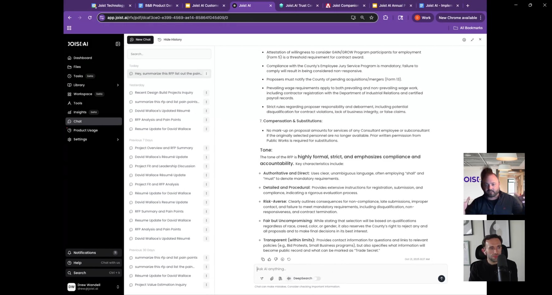 When you upload incoming RFPs of any size, Joist breaks them down within minutes, generating a comprehensive analysis that includes summary, scope, key dates, evaluation criteria, legal forms needed, and a technical proposal outline. The system automatically generates RFI questions by flagging conflicting information or unclear requirements, while identifying pain points through thematic analysis of what the client cares about most. It creates a compliance matrix to track requirements for final review and supports custom templates where you can upload your firm's go-no-go criteria, risk assessment frameworks, or legal review checklists to tailor the analysis to your specific workflow.