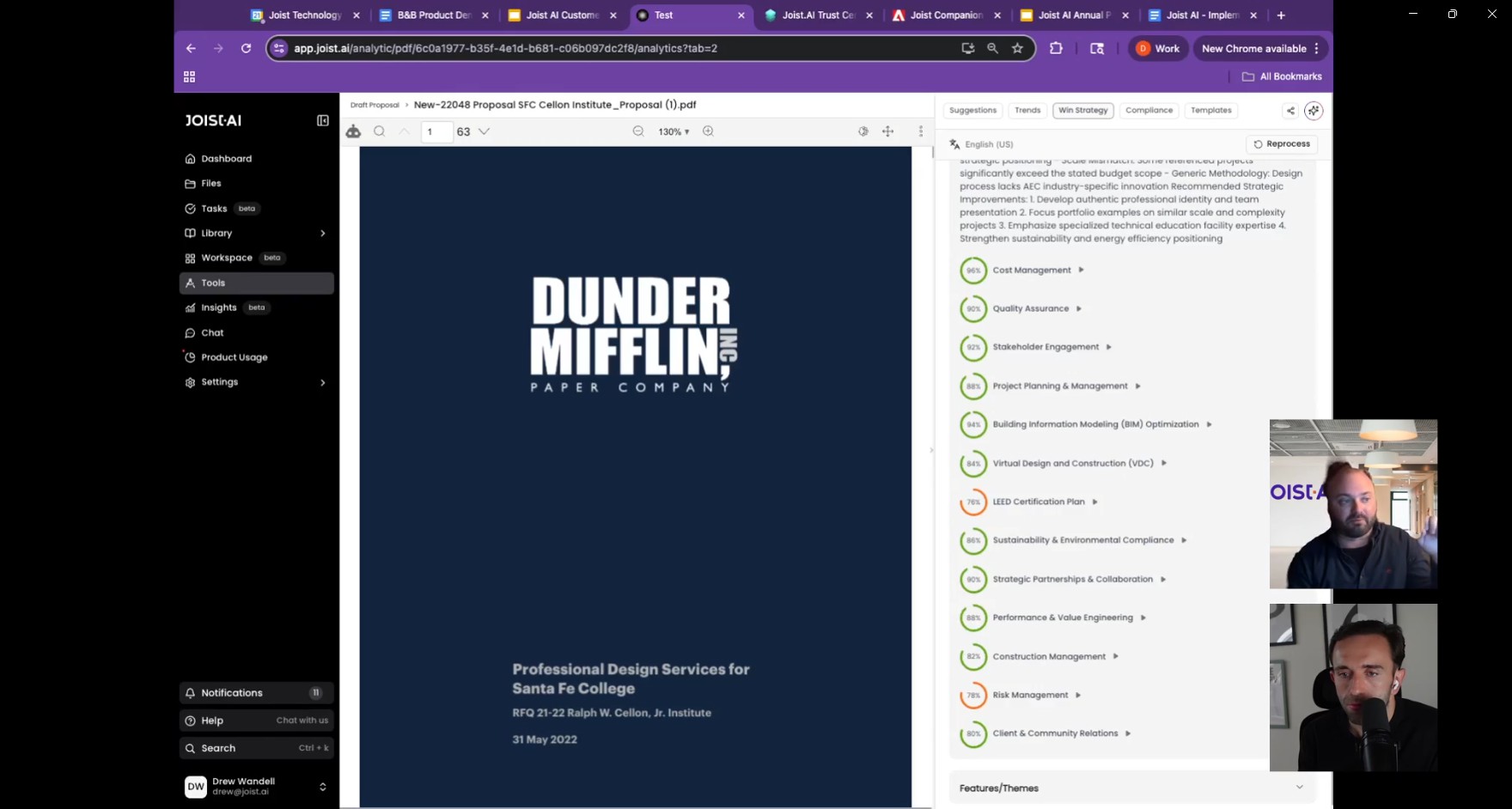 Beyond compliance, Joist provides comprehensive quality analysis by detecting spelling and grammatical errors, assessing win strategy, and identifying firm differentiators throughout your proposal. It provides coherence ratings by section to ensure your narrative flows logically and offers cross-proposal benchmarking that compares how you addressed specific topics—like risk management or safety protocols—across the last six months, surfacing better examples from your own history that you can leverage for stronger responses.